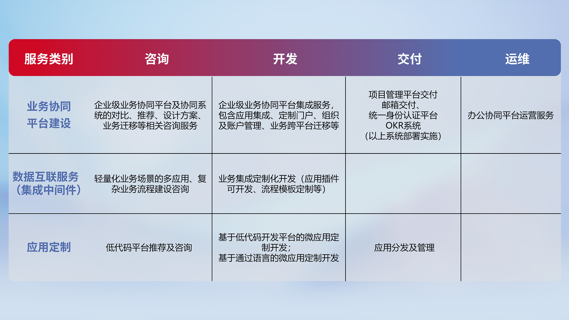 针对钉钉、、、、企微、、IDaas等平台级产品提供产品的规划、、方案、、、交付、、定制化开发等服务,,,实现如统一协同办公、、智能客户服务、、、混合会议管理、、智能数据查询、、等业务场景,,,,实现数字化转型。。。。